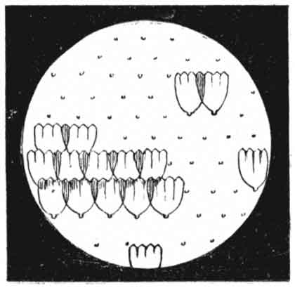 All the various parts referred to, or to be presently mentioned, may be seen in Fig. 1, which also shows a peculiarity that is [Pg 3]found in very young caterpillars of the Orange-tip, and in some others of the "Whites" (Pieridæ). The odd thing about this baby caterpillar is that the fine hair arising from each wart is forked at the tip (Fig. 1, a), and holds thereon a minute globule of fluid. When the caterpillars become about half grown these special hairs are lost in a general clothing of fine hair. Fig. 1, b, represents a magnified single ring of the caterpillar, and this shows a spiracle and the folds of the skin (subsegments). The manner in which such folding occurs is to be observed in the higher study of larval morphology.