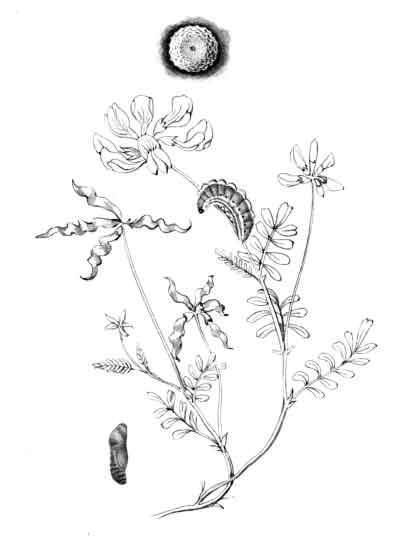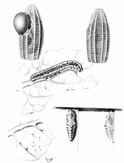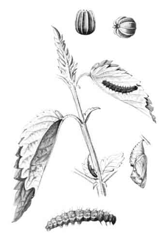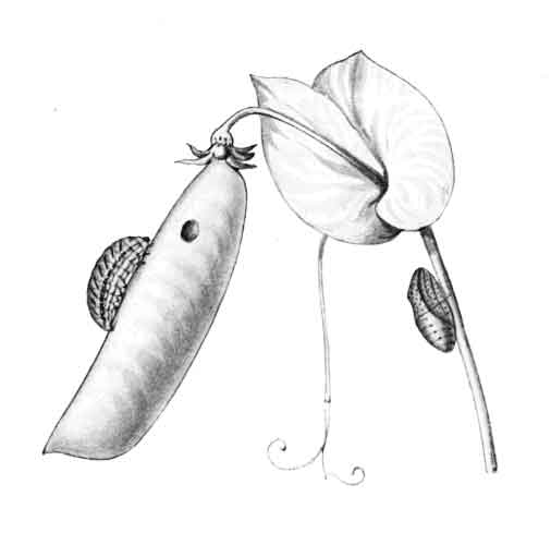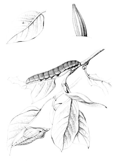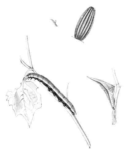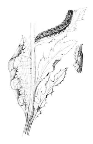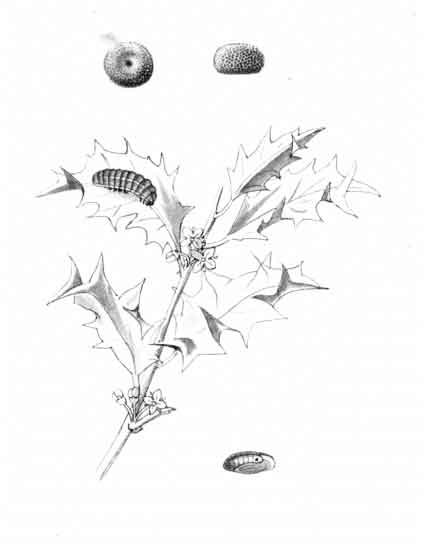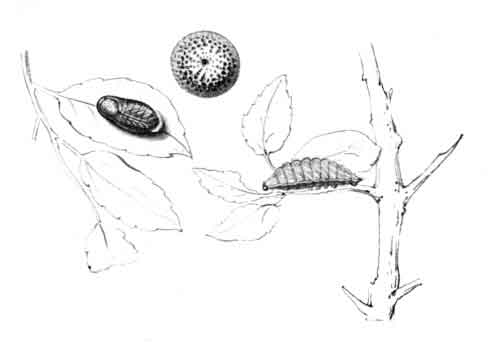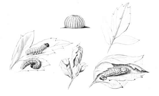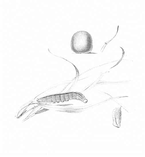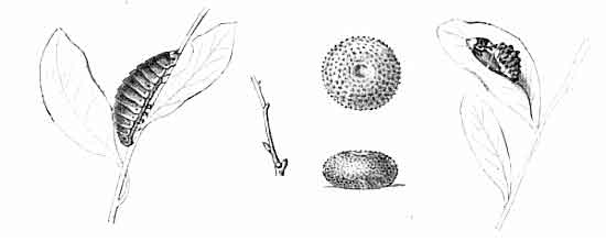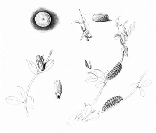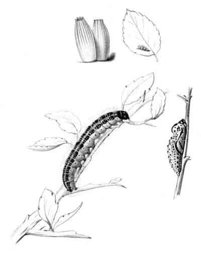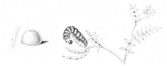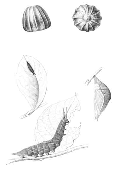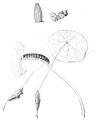 The egg "is of a long oval figure, half as long again as wide, the shell glistening, devoid of ribs or reticulation; at first white, then turning dull yellowish, and at last paler again, with the [Pg 188]dark head of the caterpillar showing through. The young caterpillar eats part of the empty egg-shell."