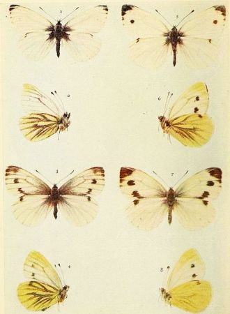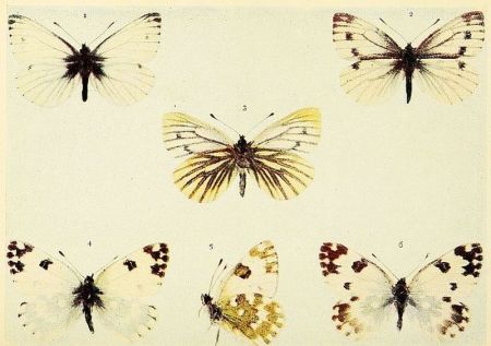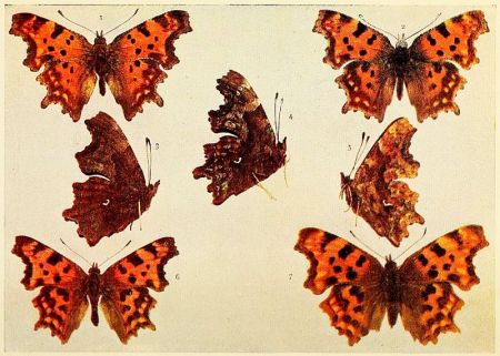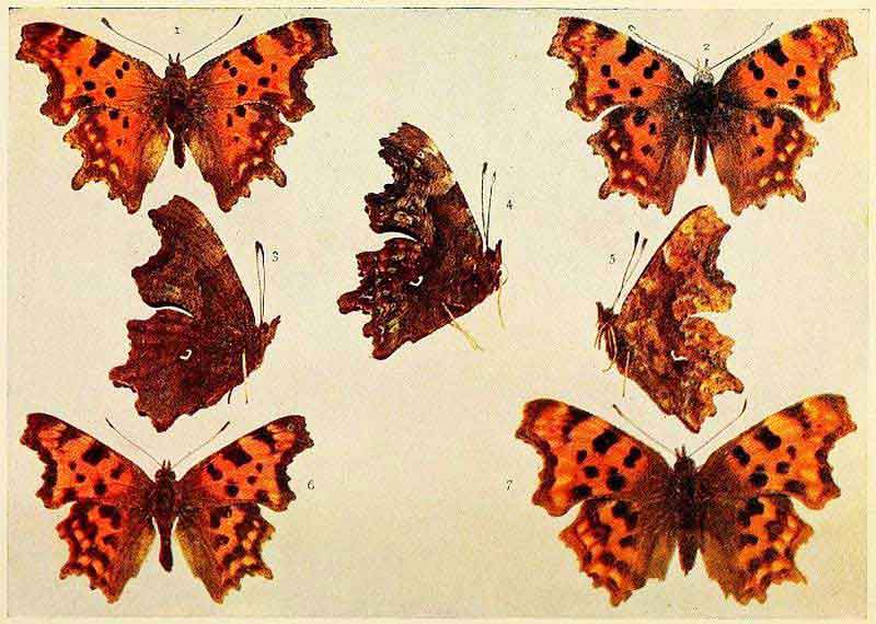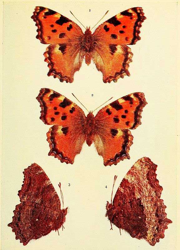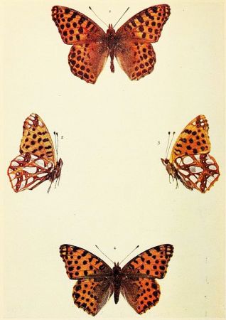 In those kinds of butterflies that attain the perfect state twice in the year, the individuals composing the first flight are somewhat different in marking from those of the second flight. Such species as the large and small whites exhibit this kind of variation, which is termed seasonal dimorphism. The males of some species, as for example the Common Blue and the Orange-tip, differ from the females in colour; this is known as sexual dimorphism. The Silver-Washed Fritillary, which has two forms of the female, one brown like the male, the other green or greenish in colour, is a good example of dimorphism confined to one sex. Gynandrous specimens, sometimes called "Hermaphrodites," are those which exhibit both male and female coloration, or other wing characters; when one side is entirely male and the other side entirely female, the gynandromorphism would be described as complete.