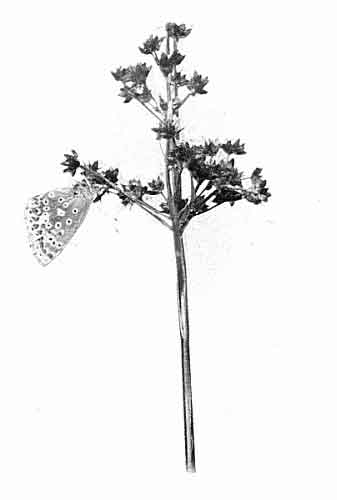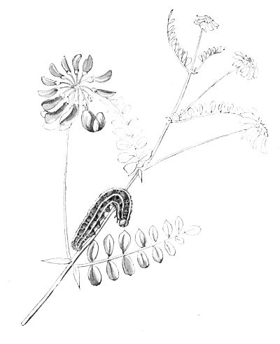 I took one or two specimens about the middle of August, 1903, in the New Forest district, and in the same month of 1905 one of two caterpillars sent to me by Dr. Chapman pupated in August, and the butterfly emerged some time in the autumn, as I found it dead in the box early in October. Both the [Pg 187]caterpillars had spun together sprays of the food-plant as shown in the figure, Plate 123. One was removed for its portrait to be taken, and it was supposed that the other bundle contained a caterpillar also, and was not examined.
