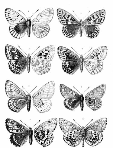 Grizzled Skipper. 1, 2, 7 male; 4, 5, 8 female; 3 var. male; 6 do. female.