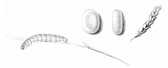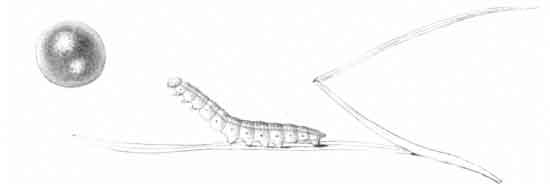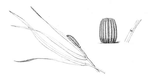 Living females received in June were placed on a growing plant of brome grass (Bromus asper), and a few eggs were deposited, some upon the blades of grass, others upon the gauze-covered glass jar in which the plant was placed; they were laid singly, firmly adhering to whatever laid upon. The first lot of eggs were deposited on June 14. The egg has a pearly appearance, being whitish or yellowish-white in colour. Ten days after the egg is deposited the young caterpillar emerges by eating away the crown. Soon after hatching out the young caterpillar makes a little tubular dwelling, drawing together the edges of the grass-blade by spinning about three or four stout cords of silk, which quickly contract, causing the edges to draw together, and sometimes to overlap, forming a compact short tube; generally before spinning it nibbles off the extreme edge of the blade where the silk is afterwards attached. It feeds upon the blade both above and below its abode, devouring so much that frequently only the midrib of the blade remains, and the tube only just long enough to conceal it; it then shifts its quarters, and prepares a new home.