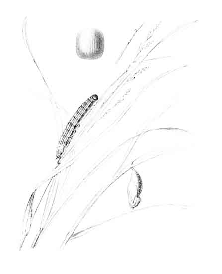 The full-grown caterpillar is of a delicate light green, the stripe along the back is rather bluish-green, with paler green central and side lines; the spiracles are flesh-coloured, and below these there is a somewhat creamy-white stripe. The head is deeper green than the body, and roughened with minute points. It feeds in June on Holcus lanatus, Brachypodium sylvaticum, and probably other kinds of soft grasses, and its assimilation, both in colour and texture, with the blades of grass is remarkable. Before changing to the chrysalis it encloses itself within two or sometimes three leaves of the grass, joined together longitudinally by lacing or spinning with white silk, the edges more or less close to each other, and becomes completely hidden.