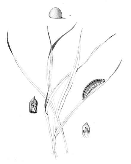 Buckler, referring to four caterpillars found on Brachypodium sylvaticum, June 11, states that they completed their growth on a diet of Triticum repens. They ate out wedge-shaped portions from the sides of the grass blades, and when they had finished their repast, they crawled down to the middle of the blade, and there spun a coating of white silk from one side to the other, causing the two edges of the blade to draw together a little, and then in the silk-lined hollow they rested until hunger obliged them to ascend the blade again for another meal. About June 23 they had ceased to feed, and were beginning to fasten themselves within more closely constructed retreats, formed where two blades of grass obliquely crossed each other. The colour of the chrysalis is similar to that of the caterpillar, and the lines are faintly traceable. The butterflies appeared July 14 to 18, emerging at night, and ready for flight in the morning.