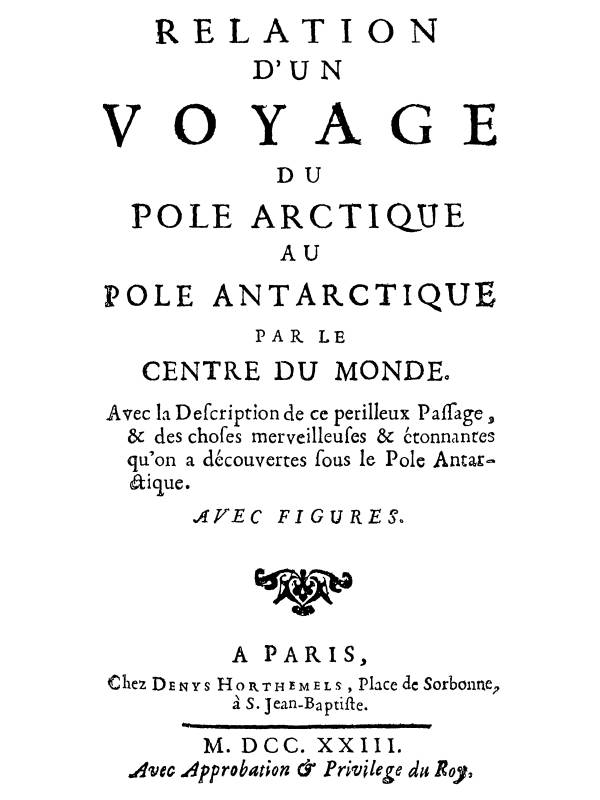 Louis par la grace de Dieu Roi de France & de Navarre: A nos amez & féaux Conseillers les Gens tenans nos Cours de Parlement, Maîtres des Requestes Ordinaires de notre Hôtel, Grand-Conseil, Prevost de Paris, Baillifs, Sénéchaux, leurs Lieutenans Civils & autres nos Justiciers qu'il appartiendra, SALUT. Notre bien-amé Gabriël Amaulry, Libraire à Paris, Nous ayant fait supplier de lui accorder nos Lettres de Permission pour l'impression d'un Livre intitulé, Relation d'un voyage du Pole Arctique au Pole Antarctique par le centre du monde; Nous avons permis & permettons par ces Presentes audit Amaulry de faire imprimer ledit Livre en tels volumes, forme, marge, caractere, conjointement ou séparement & autant de fois que bon lui semblera, & de le vendre, faire vendre & débiter par tout notre Royaume pendant le temps de trois années consécutives, à compter du jour de la date desdites Presentes: Faisons défenses à tous Libraires-Imprimeurs & autres personnes, de quelque qualité & condition qu'elles soient d'en introduire d'impression étrangere dans aucun lieu de notre obéissance; à la charge que ces Presentes seront enregistrées tout au long sur le Registre de la Communauté des Libraires & Imprimeurs de Paris, & ce dans trois mois de la date d'icelles; que l'impression de ce Livre sera faite dans notre royaume & non ailleurs, en bon papier & en beaux caracteres, conformement aux Reglemens de la Librairie; & qu'avant que de l'exposer en vente, le manuscrit ou imprimé qui aura servi de copie à l'impression dudit Livre, sera remis dans le même état où l'Approbation y aura été donnée, és mains de notre trés-cher & féal Chevalier Garde des Sceaux de France le sieur Fleuriau d'Armenonville; & qu'il en sera ensuite remis deux Exemplaires dans notre Bibliotheque publique, un dans celle de notre Chasteau du Louvre, & un dans celle de notredit trés-cher & féal Chevalier Garde des Sceaux de France le sieur Fleuriau d'Armenonville, le tout à peine de nullité des presentes, du contenu desquelles vous mandons & enjoignons de faire jouir l'Exposant ou les ayans cause pleinement & paisiblement, sans souffrir que il leur soit fait aucun trouble ou empêchement: Voulons qu'à la copie desd. presentes, qui sera imprimée tout au long au commencement ou à la fin dudit Livre, foy soit ajoutée comme à l'original. Commandons au premier notre Huissier ou Sergent de faire pour l'execution d'icelles tous actes requis & necessaires, sans demander autre permission & nonobstant clameur de Haro Charte Normande & Lettres à ce contraires: Car tel est notre plaisir. Donné à Paris le dit huitiéme jour du mois de Septembre, l'an de grace mil sept cens vingt deux, & de notre Regne, le huitiéme. Par le Roi en son Conseil.