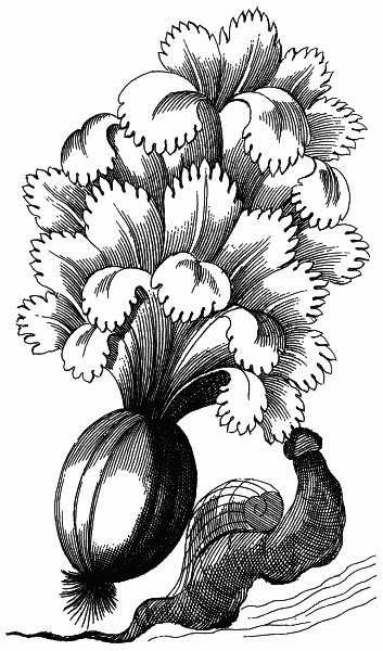 Comme j'avois vû par le moyen de mes Lunettes d'approche, que de l'autre côté du Golfe le Païs étoit beaucoup moins montagneux & plus beau, j'engageai quelques-uns de mes Compagnons de voyage à y faire quelques courses avec moi, ce que nous executâmes bien-tôt après. Nous trouvâmes d'abord un terrain assez plat & uni, mais pierreux, & il me sembla qu'on en auroit pû tirer des pierres fort propres à bâtir; j'y vis même de lieu en lieu de grands trous presque comblez, qu'on auroit pû prendre pour des carrieres: nous avions pour lors vis à vis de nous un grand Côteau qui nous bornoit la vûe, je montai sur une éminence, pour voir si je pourrois découvrir ce qui étoit au delà, & j'apperçûs trois grands côteaux qui faisoient un angle irrégulier, & renfermoient une belle & spacieuse Plaine. Nous n'eûmes pas beaucoup de peine à y descendre, elle étoit si parfaitement plate dans toute son étendue, qu'on n'y pouvoit pas remarquer la moindre hauteur, ni le moindre enfoncement; l'herbe dont elle étoit couverte, étoit alors toute humide, comme si une abondante rosée étoit tombée depuis peu dessus: J'aperçûs le long des Côteaux une infinité de longues rayes blanches, brillantes comme du vif argent, qui se croisoient de cent façons, de haut en bas & de bas en haut; je m'en aprochai, & je vis de tous côtez une espece de limaçons quatre fois plus gros que ceux de nos Climats, qui portoient sur leur dos une coquille d'un trés beau verd; ils avoient le corps noir, la queuë longue, & une petite tête sans cornes, ils laissoient en se glissant sur la terre une trace de grosse écume blanche qui faisoit ces longues rayes dont je viens de parler. Ils rongeoient trés volontiers une Plante qui croissoit dans cette Plaine, & qui est si belle & si singuliere qu'elle mérite bien d'être décrite ici. Elle s'éleve au dessus de terre à la hauteur d'environ une coudée, & jette vingt-cinq ou trente feuilles fort serrées par en bas, mais qui s'élargissent considérablement par en haut: ces feuilles sont de la largeur d'un empan avec des pointes tout autour aussi dures & aigues que des épines; elles sont d'un trés-beau verd pâle, & pleines de grandes veines du plus bel aurore qu'on puisse voir: Nous en arrachâmes quelques-unes, mais avec assez de peine, à cause des pointes dont elles sont armées, & nous fûmes surpris de voir que leur racine avoit la véritable figure d'un melon, la peau d'un gris brun divisée par côtes, & rude au toucher comme du chagrin; le dedans étoit une chair molle, blanchâtre, spongieuse & d'une odeur desagréable, ce qui nous empêcha d'en goûter; mais s'il n'y a rien de bon à manger, on y trouve de quoi satisfaire la vûë: J'ai vû plus de cent de ces limaçons ronger une seule de ces Plantes. On en verra le dessein tiré d'aprés nature à la figure F.
