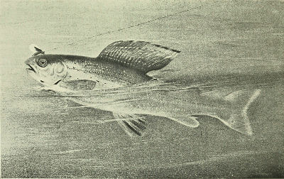 The highflyers, or finny acrobats, are the tarpon, kingfish, ladyfish and ten-pounder. The first-named is so well known that further mention here is unnecessary, and moreover I have accorded it a special article, for it trots alone in its class; but while the ladyfish and ten-pounder are only a couple of feet in length, they are still worthy to be named in connection with his silver majesty.[153] They are built for aërial as well as for submarine navigation, and dart so quickly from one element to the other that it is somewhat bewildering to watch one at the end of a line. Twenty-five years ago I compared the ladyfish to a "silver shuttle," for such it appeared in its efforts to escape when hooked.