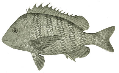 The snook is a good game-fish, strong and active, rises to the fly in shallow water, and will take any kind of fish or crab bait, or the trolling-spoon. It is shaped somewhat like the pike-perch, with the flattened head and jaws of the pike minus its sharp teeth. It is attired in a silvery mantle with a broad, black stripe running along the side from head to tail. It is a fair food-fish if skinned instead of scaled. It is known as snook on the east coast, and as rovallia on the west coast, a corruption of its Cuban name, robalo. It grows to two or three feet and twenty to thirty pounds. Heavy[158] black bass, or light striped bass, tackle is necessary to withstand its fierce rushes when hooked.