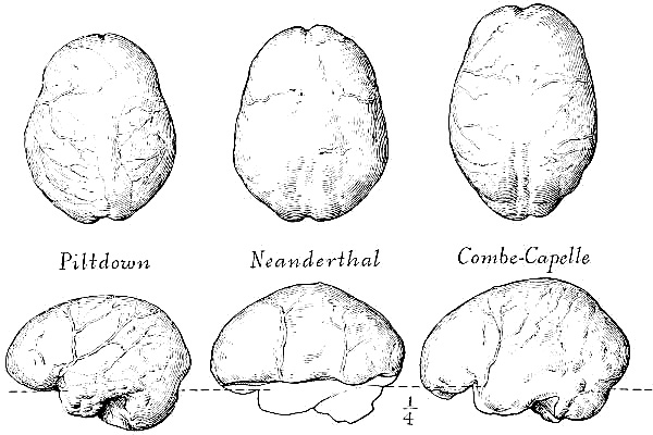 [AB] The reconstruction (Fig. 66) of the Piltdown skull made by Professor J. H. McGregor has a cranial capacity of about 1300 c.cm. The brain (Fig. 70) is seen to be very narrow and low in the prefrontal area, the seat of the higher mental faculties. In the reconstruction the cranial region is in the main very like the second restoration by Doctor Smith Woodward, but the jaws differ in some respects. The tooth hitherto regarded as a right lower canine, is now placed as the left upper canine, in accord with the conclusions of the author of this work and of Doctors Matthew and Gregory of the American Museum of Natural History. The dental arches are more curved, thus more human and less ape-like than in the Smith Woodward restoration, and the chin region is made somewhat deeper, thus giving a somewhat less prognathous aspect to the face.