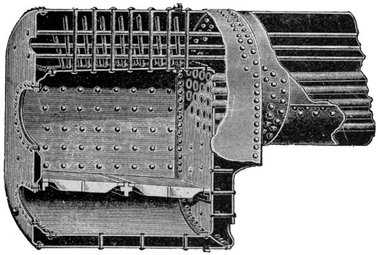 Fire-box—A nearly square space at one end of a boiler, in which the fire is placed. Properly it is surrounded on all sides by a double wall, the space between the two shells of these walls being filled with water. All flat surfaces are securely fastened by stay bolts and crown bars, but cylindrical surfaces are self-bracing.