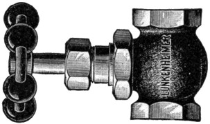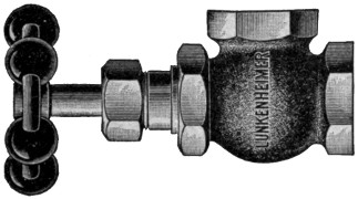 Below the lower gauge cock there is another cock used for draining the gauge and blowing it off when there is a pressure of steam on. By occasionally opening this cock, allowing the heated water or steam to blow through it, the engineer may always be sure that the passages into the water gauge are not stopped up by any means. By closing the upper cock and opening the lower, the passage into the lower may be cleared by blowing off the drain cock; by closing the lower gauge cock and opening the upper the passage from the steam space may be cleared and tested in the same way when the drain cock is opened. If the glass breaks, both upper and lower gauge cocks should be closed instantly.