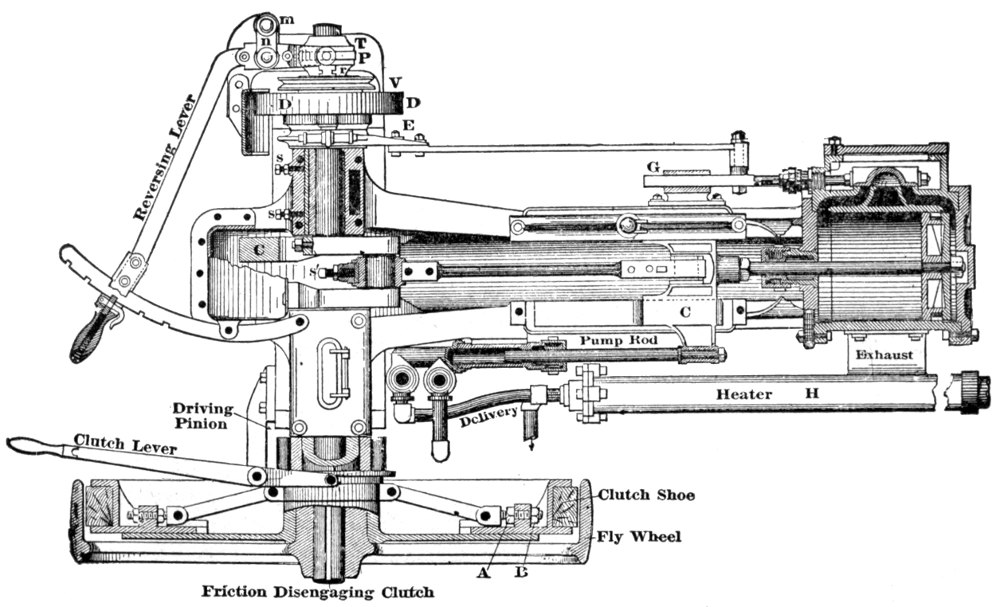Two injectors are furnished with this engine, and the use of the injector is recommended, contrary to the general belief that a pump is more economical. The company contends that the long exhaust pipe causes more back pressure on the cylinder than would be represented by the saving of heat in the heater. However, a cross-head pump and special condensing heater will be furnished if desired.