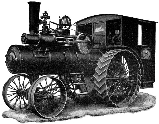 The side gear is used with a crank disc instead of arm. The reverse is the Grime, a single eccentric with device for shifting for reverse. The friction clutch has unusually long shoes, working inside the flywheel, with ample clearance when lever is off. A specialty is made of extra wide traction wheels for soft country. The traction gear is of the spur variety. There is also a double speed device offered as an extra.