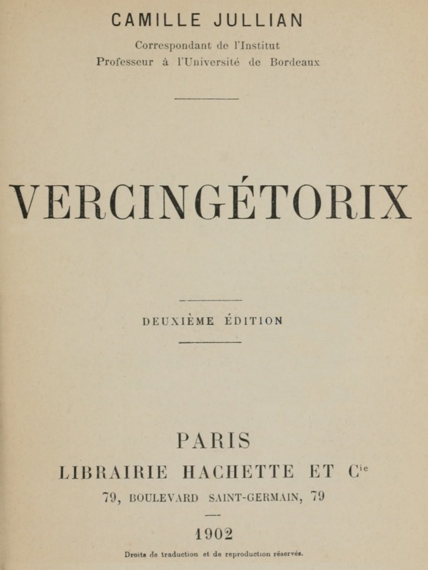 [175] Bien que j’aie voulu, à ces quelques notes près, exclure de ce livre son appareil critique et bibliographique, me réservant de le publier ailleurs, il est cependant de mon devoir de rappeler que la vie de Vercingétorix a donné lieu, à la fin du XIXe siècle, à trois travaux spéciaux: le livre de Fr. Monnier, Vercingétorix et l’indépendance gauloise, religion et institutions celtiques (2e édit., 1875, Paris, Didier), œuvre d’imagination et de verve, trop influencée par certaines rêveries des «celtomanes» de son temps; les articles de M. Albert Réville, Vercingétorix et la Gaule au temps de la conquête romaine (Revue des Deux Mondes des 15 août et 1er sept. 1877), suggérés par le volume de Monnier, mais pleins de remarques originales et d’hypothèses vraisemblables; le livre de notre ami regretté Corréard, Vercingétorix ou la chute de l’indépendance gauloise (3e édit., 1889): livre destiné sans doute à la Bibliothèque des Écoles et des Familles (Paris, Hachette), mais qui est l’ouvrage le plus sain et le plus sobre qu’ait provoqué la vie de Vercingétorix, et qui est une œuvre de haute probité historique, c’est-à-dire faite à la fois avec l’étude immédiate des sources et la franchise reconnaissante des emprunts aux devanciers.