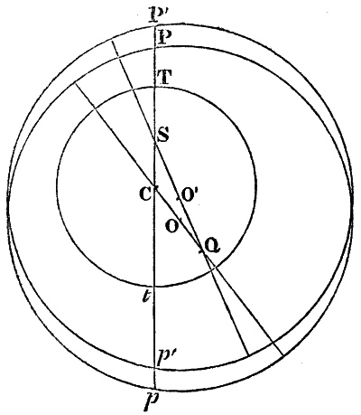 The other stars were supposed to be fixed in an outer orb, beyond which were two crystalline spheres, (as they were called,) and on the outside of all, the primum mobile or first moveable, which sphere was supposed to revolve round the earth in twenty-four hours, and by its friction, or rather, as most of the philosophers of that day chose to term it, by the sort of heavenly influence which it exercised on the interior orbs, to carry them round with a similar motion. Hence the diversity of day and night. But beside this principal and general motion, each orb was supposed to have one of its own, which was intended to account for the apparent changes of position of the planets with respect to the fixed stars and to each other. This supposition, however, proving insufficient to account for all the irregularities of motion observed, two hypotheses were introduced.—First, that to each planet belonged several concentric spheres or heavens, casing each other like the coats of an onion, and, secondly, that the centres of these solid spheres, with which the planet revolved, were placed in the circumference of a secondary revolving sphere, the centre of which secondary sphere was situated at the earth. They thus acquired the names of Eccentrics or Epicycles, the latter word signifying a circle upon a circle. The whole art of astronomers was then directed towards inventing and combining different eccentric and epicyclical motions, so as to represent with tolerable fidelity the ever varying phenomena of the heavens. Aristotle had lent his powerful assistance in this, as in other branches of natural philosophy, in enabling the false system to prevail against and obliterate the knowledge of the true, which, as we gather from his own writings, was maintained by some philosophers before his time. Of these ancient opinions, only a few traces now remain, principally preserved in the works of those who were adverse to them. Archimedes says expressly that Aristarchus of Samos, who lived about 300 B. C., taught the immobility of the sun and stars, and that the earth is carried round the central sun.[18] Aristotle's words are: "Most of those who assert that the whole concave is finite, say that the earth is situated in the middle point of the universe: those who are called Pythagoreans, who live in Italy, are of a contrary opinion. For they say that fire is in the centre, and that the earth, which, according to them, is one of the stars, occasions the change of day and night by its own motion, with which it is carried about the centre." It might be doubtful, upon this passage alone, whether the Pythagorean theory embraced more than the diurnal motion of the earth, but a little farther, we find the following passage: "Some, as we have said, make the earth to be one of the stars: others say that it is placed in the centre of the Universe, and revolves on a central axis."[19] From 13which, in conjunction with the former extract, it very plainly appears that the Pythagoreans maintained both the diurnal and annual motions of the earth.