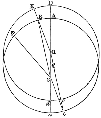 With this confirmation of the supposition, Newton proceeded to the purely geometrical calculation of the law of centripetal[198] force necessary to make a moving body describe an ellipse round its focus, which Kepler's observations had established to be the form of the orbits of the planets round the sun. The result of the inquiry shewed that this curve required the same law of the force, varying inversely as the square of the distance, which therefore of course received additional confirmation. His method of doing this may, perhaps, be understood by referring to the last figure but one, in which Cd, for instance, representing the space fallen from any point C towards S, in a given time, and the area CSD being proportional to the corresponding time, the space through which the body would have fallen at C in any other time (which would be greater, by Galileo's law, in proportion to the squares of the times), might be represented by a quantity varying directly as Cd, and inversely in the duplicate proportion of the triangular area CSD, that is to say, proportional to Cd/ (SC × Dk)², if Dk be drawn from D perpendicular on SC. If this polygon represent an ellipse, so that CD represents a small arc of the curve, of which S is the focus, it is found by the nature of that curve, that Cd/ (Dk)² is the same at all points of the curve, so that the law of variation of the force in the same ellipse is represented solely by 1/ (SC)². If Cd, &c. are drawn so that Cd/ (Dk)² is not the same at every point, the curve ceases to be an ellipse whose focus is at S, as Newton has shewn in the same work. The line to which (Dk)²/ Cd is found to be equal, is one drawn through the focus at right angles to the longest axis of the ellipse till it meets the curve;—this line is called the latus rectum, and is a third proportional to the two principal axes.