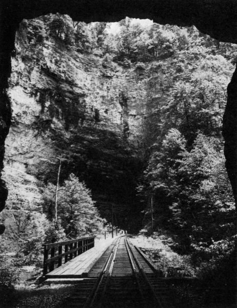 The Natural Tunnel located in Purchase Ridge near Big Stone Gap and Bristol is a tunnel approximately nine hundred feet long, one hundred and fifty feet wide and one hundred feet high, carved by flowing water through solid mountain terrain. The tunnel itself includes a reverse curve, and, at the present time, railroad tracks and Stock Creek waters run through it.