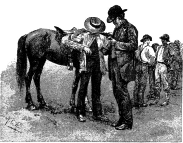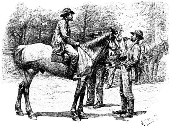 Over this road, then, and towards this town, one day, five summers ago, I was picking my course, but not without pale human apprehensions. At that time one did not visit Pineville for nothing. When I reached it I found it tense with repressed excitement. [286] Only a few days previous there had been a murderous affray in the streets; the inhabitants had taken sides; a dead-line had been drawn through the town, so that those living on either side crossed to the other at the risk of their lives; and there was blue murder in the air. I was a stranger; I was innocent; I was peaceful. But I was told that to be a stranger and innocent and peaceful did no good. Stopping to eat, I fain would have avoided, only it seemed best not to be murdered for refusing. All that I now remember of the dinner was a corn-bread that would have made a fine building stone, being of an attractive bluish tint, hardening rapidly upon exposure to the atmosphere, and being susceptible of a high polish. A block of this, freshly quarried, I took, and then was up and away. But not quickly, for having exchanged my horse for another, I found that the latter moved off as though at every step expecting to cross the dead-line, and so perish. The impression of the place was one never to be forgotten, with its squalid hovels, its ragged armed men collected suspiciously in little groups, with angry, distrustful faces, or peering out from behind the ambush of a window.