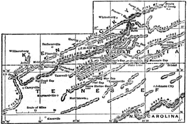It is necessary once more to define topographical bearings. Running north-east and south-west is this Cumberland Mountain, having an elevation of from twenty-five hundred to three thousand feet. Almost parallel with it, from ten to twenty miles away, and having an elevation of about two thousand feet, lies Pine Mountain, in Kentucky. In the outer or Cumberland Mountain it has now been seen that there are three remarkable gaps: Big [313] Stone Gap on the east, where Powell's River cuts through Stone Mountain; Cumberland Gap intermediate, which is not a water-gap, but a depression in the mountain; and Big Creek Gap in the west, where Big Creek cuts through Walden's Mountain—the last being about forty miles distant from the second, about ninety from the first. Now observe that in Pine Mountain there are three water-gaps having a striking relation to the gaps in the Cumberland—that is, behind Cumberland Gap is the pass at Pineville; behind Big Stone Gap and beyond it at the end of the mountain are the Breaks of Sandy; and behind Big Creek Gap are the Narrows, a natural water-gap connecting Tennessee with Kentucky.