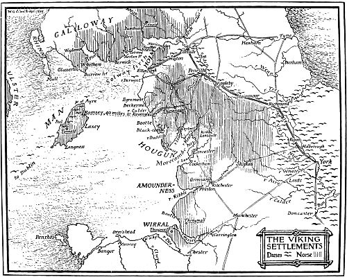 In 875 Halfdan returned from his campaign against Alfred and the year after he divided the lands of Northumbria amongst his followers. In many parts we find groups of Scandinavian place-names so close and thick, says Mr. W. G. Collingwood in his "Scandinavian Britain," that we must assume either depopulation by war, or the nearly complete absence of previous population.