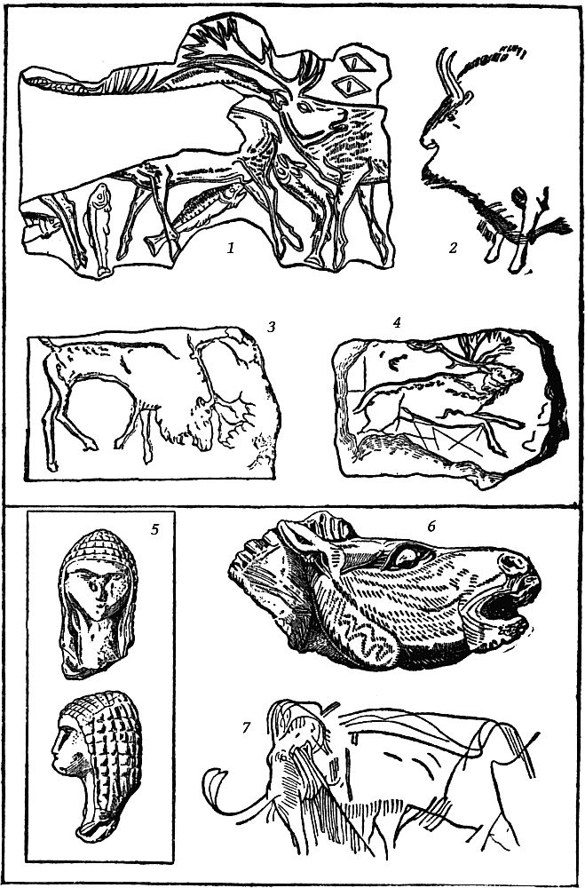 Carvings in Ivory (1 and 3–7) and in Stone of Cavern Walls (2), made by the Hunters of the Middle Stone Age