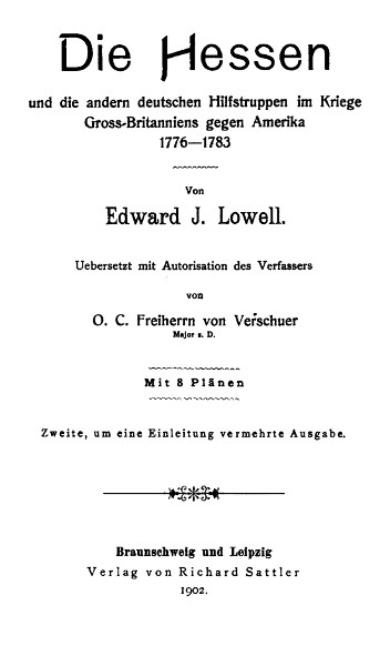 Ich kann nicht behaupten, bei der Bearbeitung des vorliegenden Buches annähernd alle die sehr inhaltreichen Quellen, die die Bibliotheken und Archive in Deutschland enthielten, benutzt zu haben. Ich habe indessen deutsche Originalberichte von jedem wichtigen Engagement gefunden und von beinahe jedem Scharmützel im Revolutionskriege vom Jahr 1776 bis zum Ende, ausgenommen einige von den Gefechten, die in Carolina und Georgia stattfanden und in denen wenige, wenn überhaupt, Deutsche engagiert waren. Einige von diesen Berichten sind, glaube ich, niemals einem amerikanischen Schreiber vor Augen gekommen.