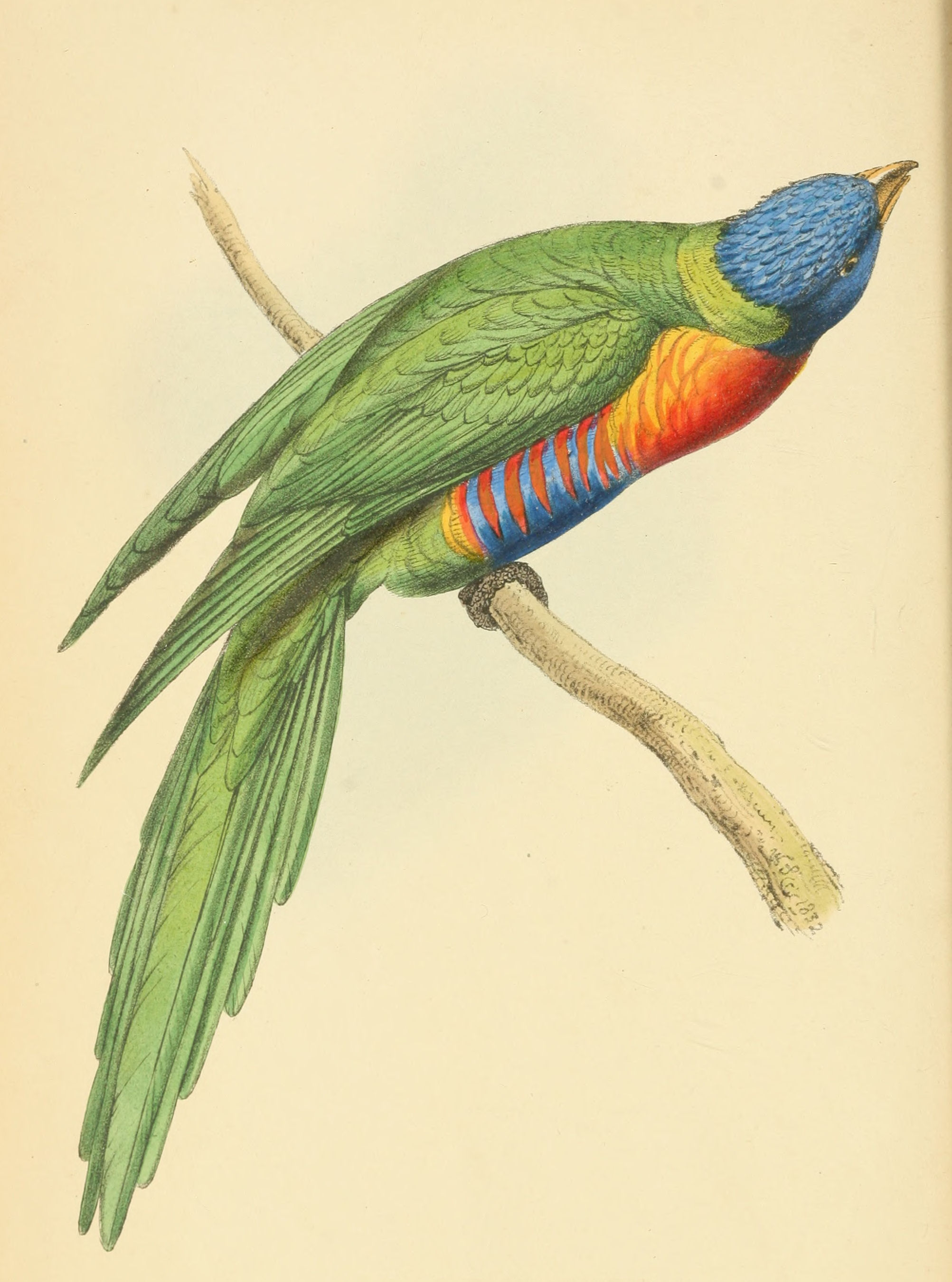 Large flocks of these resplendent Lorys enliven the woods of New Holland, clinging to the Eucalypti trees, and sucking the honey from the blossoms by their brush-shaped tongue. Mr. Caley, whose notes we now follow, says it a bird remarkable for docility and attachment to some people, although a perfect scold to others. When young they are caught by the natives, but from the loss of their favourite food seldom survive in confinement. An individual, kept by Mr. Caley, on being shewn the coloured drawing of a native plant, tried to suck the flowers, and it even made the same attempt with a piece of cotton furniture. Its scientific history we have already given elsewhere.
