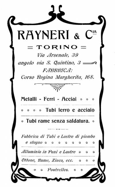 Tubi tipo Mannesmann, in acciaio dolce, senza saldatura, laminati a freddo, qualità speciale per automobili. Tubi tipo Mannesmann, in acciaio senza saldatura, laminati a caldo per caldaie; da mm. 32 a mm. 170. Tubi tipo Mannesmann, senza saldatura, con vite e manicotto; da mm. 21 a mm. 127. Tubi di rame, senza saldatura, dello spessore di mm. 1, 1 1⁄2, 2, 2 1⁄2 e da mm. 3 a mm. 80 di diametro. Tubi di ottone, della Casa James Booth & C. di Birmingham, del diametro esterno da mm. 2 a mm. 75. Lamiere, in acciaio, extra lucide, dolcissime, atte a lavorarsi al tornio. Ribattini e Rosette in rame. Saldatori, lampade per saldare, chiavi di forza, filiere, ecc., ecc. Contatori per gas, acqua ed elettricità.