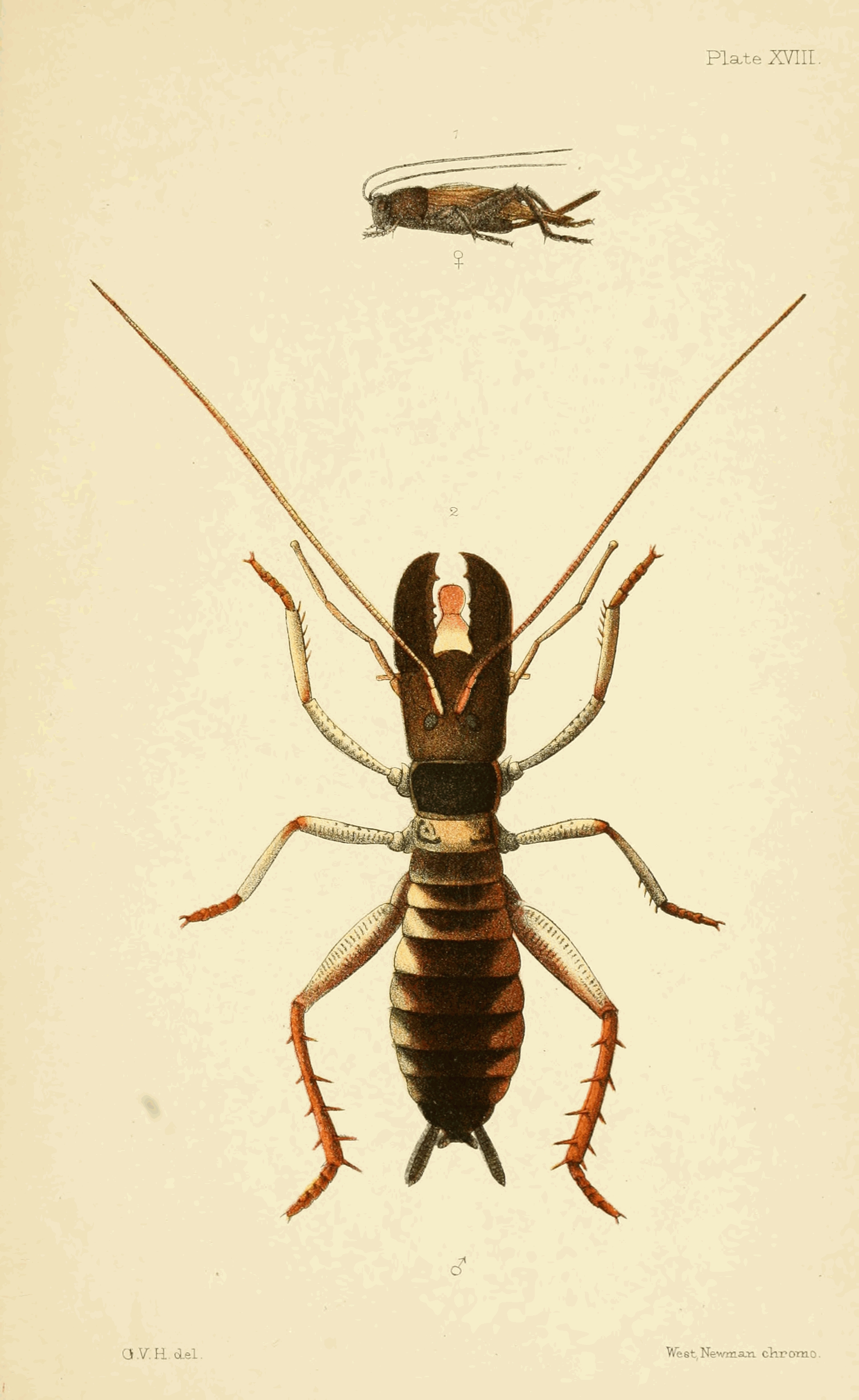 Wings four, of nearly equal size; the anterior pair often more or less leathery, but with distinct veins. The larva and pupa closely resembling the imago; the latter with rudimentary wings. In the instances where these organs are wanting in the mature insect, the metamorphosis merely consists of a series of moultings, and it is consequently a matter of some difficulty to determine when the insect is full-grown. This Order is of small extent; it includes the Earwigs, Cockroaches, Grasshoppers, Crickets, Termites, Dragonflies, Mayflies and Perlidæ; the last four being transferred from the Neuroptera of most authors. The minute species of Mallophaga and Thysanura will also come under this heading. (Plates XV., XVI., XVII., XVIII., XIX.)