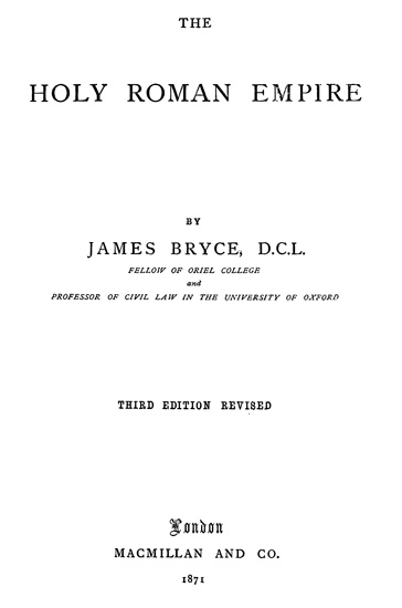 The object of this treatise is not so much to give a narrative history of the countries included in the Romano-Germanic Empire—Italy during the middle ages, Germany from the ninth century to the nineteenth—as to describe the Holy Empire itself as an institution or system, the wonderful offspring of a body of beliefs and traditions which have almost wholly passed away from the world. Such a description, however, would not be intelligible without some account of the great events which accompanied the growth and decay of imperial power; and it has therefore appeared best to give the book the form rather of a narrative than of a dissertation; and to combine with an exposition of what may be called the theory of the Empire an outline of the political history of Germany, as well as some notices of the affairs of mediæval Italy. To make the succession of events clearer, a Chronological List of Emperors and Popes has been prefixed[1].