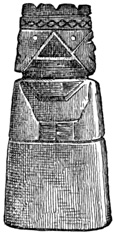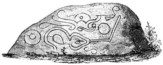 The province of Chiriquí lies on the Pacific side of the Isthmus, and it is in its central region about the town of David, that monuments of a past age have been unearthed.[II-3] These monuments are of three classes; the first consisting of rude figures cut on the surface of large boulders. The best known of this class, and in fact the only one definitely described, is the Piedra Pintal at Caldera, a few leagues from David, which is fifteen feet high, about sixteen in diameter, and somewhat flattened at the top. Top and sides are covered with curves, ovals, and concentric rings; while on the eastern side there are also fantastic figures, with others supposed to represent the sun, a series of varying heads, and scorpions. The figures are cut to a depth of about one inch, but on the parts most exposed to the weather are nearly effaced.