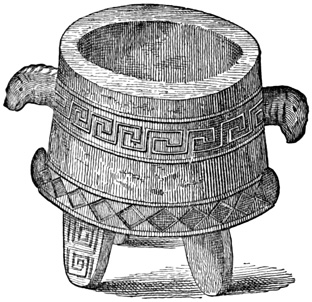In respect of ancient remains the Mosquito Coast has proved even more barren of results than Costa Rica. A pair of remarkable granite vases preserved in an English museum are said to have come from this region, but as no particulars of their discovery are given, it is of course possible, considering the former unsettled condition of all Central American boundary lines, not altogether remedied in later times, that there may be an error in locality. It is from ten to twelve inches in diameter and height, as nearly as can be ascertained from the drawing, and Humboldt remarks the similarity of its ornamentation to that found on some parts of the ruins of Mitla in Oajaca, 26 described in a future chapter. One of the vases as represented in Humboldt's drawing, is shown in the cut. The second vase is somewhat larger, more nearly uniform in size at top and bottom, with plain legs, only diamond-shaped ornaments on the body of the vessel, and handles which take the form of a head and tail instead of two heads as in the first specimen.[II-26]