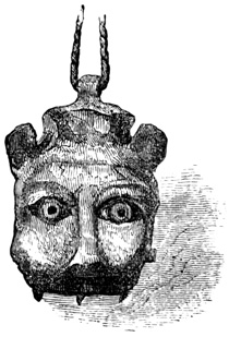 The golden ornaments taken from the huacas of Chiriquí amount to many thousands of dollars in value. They are of small size, never exceeding a few inches in either dimension, are all cast and never soldered, and take the shape of men, animals, or birds. One represents a man holding a bird in each hand, with another on his forehead. The gold is described by Dr Davis as being from ten to twenty carats fine, with some copper alloy; but by another party the alloy is pronounced silver.[II-6] Of stone are found ornaments, such as round agates pierced in the middle; weapons, including axes, chisel-heads, and arrow-heads, the latter of peculiar make, being pyramidal in form, with four cutting edges converging to a point, and in some instances apparently intended to fit loosely into a socket on the shaft; images, perhaps idols, in the shape of animals or men, but these are of comparatively rare occurrence;[II-7] and various articles of unknown use. One of the latter dug up at Bugabita is described as a "horizontal tablet, supported on ornamented legs, and terminating in the head of a monster—all neatly carved from a single stone," being twenty inches long, eight inches high, and weighing twenty-five pounds. Another was conjectured to have served for grinding paints.[II-8] Articles 19 of burned clay are more numerous in the huacas than those of other material. Small vases, jars, and tripods, some of the latter having their three legs hollow and containing small earthen balls which rattle when the vessels are moved, with musical instruments, compose this class of relics. The earthen ware has no indication of the use of the potter's wheel; is found both glazed and unglazed; is painted in various colors, which, however, are not burned in, but are easily rubbed off when moist; and many of the articles are wholly uninjured by time. The specimens, or some part of each, are almost invariably molded to imitate some natural object, and the fashioning is often graceful and true to nature. Perhaps the most remarkable of these earthen specimens, and indeed of all the Chiriquí antiquities, are the musical wind-instruments, or whistles. These are of small dimensions, rarely exceeding four inches in length or diameter, with generally two but sometimes three or four finger-holes, producing from two to six notes of the octave. No two are exactly alike in form, but most take the shape of an animal or man, the mouth-hole being in the tail of the tiger and bird, in the foot of the peccary, in the elbow of the human figure. Some have several air-cavities with corresponding holes to produce the different notes, but in most, the holes lead to one cavity. One had a loose ball in its interior, whose motion varied the sounds. Several are blown like fifes, and nearly all have a hole apparently intended for suspending the instrument by a string.[II-9] Other antiquities are reported to exist at various points of the Isthmus, which white men have never seen; instance a rocking stone in the mountains of Veragua.[II-10]
