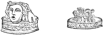 Another lava boulder similarly incised found in the parish of San Miguel is pronounced by Mr Squier, from the examination of a drawing, to resemble stones seen by him in other parts of Central America. I copy Seemann's cuts of several of the characters.[II-4] The second class includes a few stone columns, some of them ten or twelve feet high, found at David and in Veragua as well. These seem never to have been seen in situ, but scattered and sometimes used for building purposes by the present inhabitants. Their peculiarity is that the characters engraved on their surface are entirely different from those of the Piedra Pintal, being smaller and cut in low relief. Drawings of these possibly hieroglyphic signs, by which to compare them with those of Copan, Palenque, and Yucatan, are not extant. The third class comprises the huacas, or tombs, a large number of which have been opened, and a variety of deposited articles brought to light. The tombs themselves are of two kinds. Those of the first kind are mere pebble-heaps, or mounds, three or four feet high, and the only articles taken from them are three-legged stones for grinding corn, known in all Spanish America as metates. The other graves have rude boxes or coffins of flat 18 stones, with, in a few instances, rude stone posts several feet in height. Graves of this class are found to contain golden ornaments, with trinkets and implements of stone and burned clay. In most of them no traces of human remains are met; and when human bones do occur, they usually crumble to dust on exposure to the air, one skull, however, described as broad in the middle and flat behind, having been secured, and a plaster cast exhibited to the American Ethnological Society.[II-5]