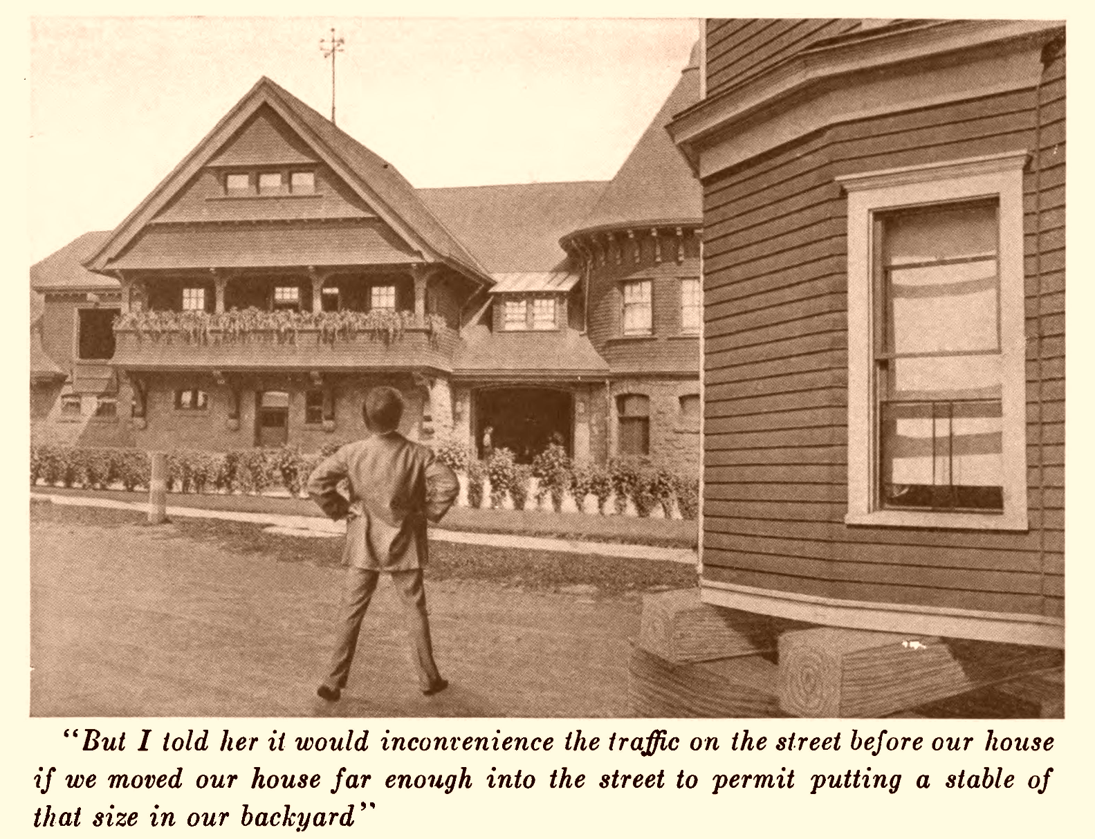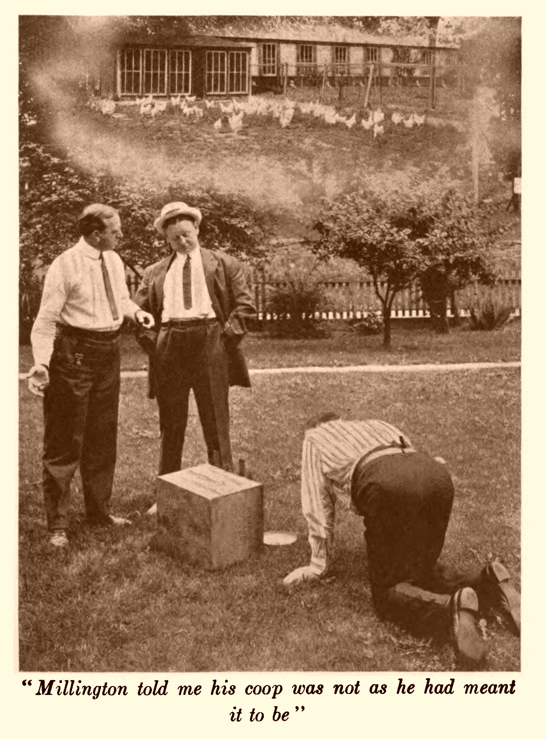 I liked Millington. He was a short, Napoleon-looking man, with bulldog jaws and not very much hair, and I was glad to have him for a neighbour, particularly as my neighbour on the other side was a tall, haughty-looking man. He leaned on the division fence and stared all the while our furniture was being moved in. I spoke to Millington about him, and all Millington said was: “Rolfs? Oh, he's no good! He won't ride in an automobile.”
