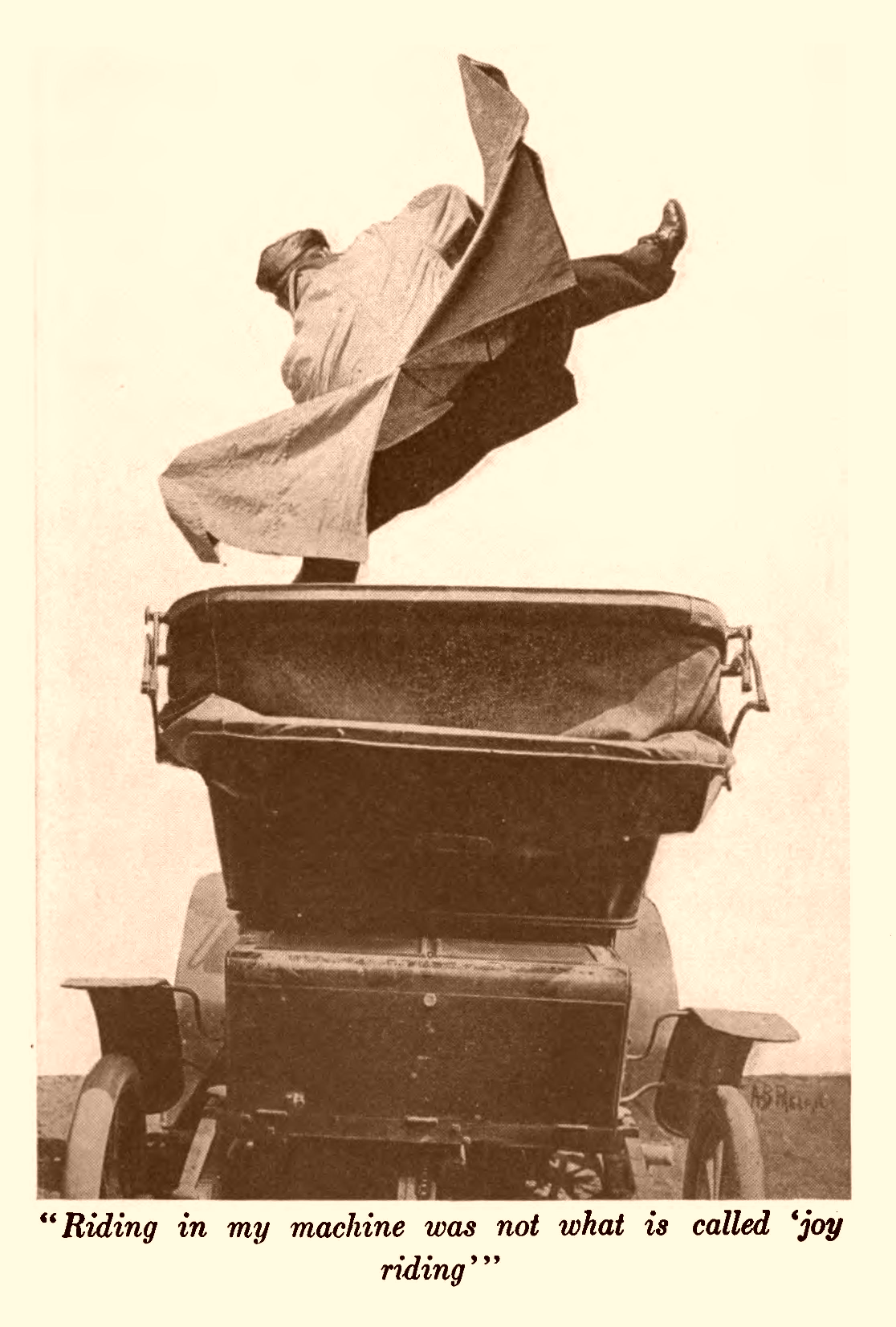 I myself found that after the first novelty wore off automobiling became a bore. As a method of securing pleasure the cost per gallon to each unit of joy was too high, in that machine. Riding in my machine was not what is called “joy riding.” It was more like a malady.