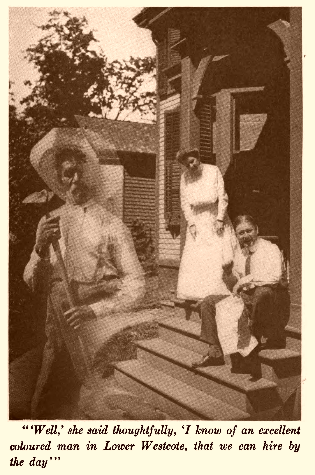 “Well,” she said thoughtfully, “I know of an excellent coloured man in Lower Westcote, that we can hire by the day—I mean that we can get to move into the flat—but I can hardly afford, with my present allowance, to pay his wages—that is, I mean—”