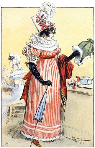 Modes dites à la Bastille.—Modes révolutionnaires.—Notre-Dame de Thermidor.—Incroyables et merveilleuses.—L'antiquité à Paris.—Athéniennes et Romaines.—Une livre de vêtements.—Tuniques diaphanes.—Maillots, bracelets et cothurnes.—Le réticule ou ridicule.—Le bal des Victimes.—Perruques blondes et oreilles de chien.—A la Titus.—Les robes-fourreau.—Petits bonnets et Chapeaux-Shakos.—Les turbans. 252 |