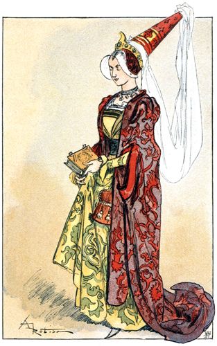 Quand la pierre se découpe, se tord, flamboie presque en magnifiques efflorescences sculptées, l'étoffe plus souple se découpe, se tord et flamboie aussi. Les hautes coiffures que nous qualifions d'extravagantes, ce sont les toits effilés des tourelles qui montent partout vers le ciel. Tout est multicolore, les gens d'alors aiment les couleurs gaies, toute la gamme des jaunes, des rouges, des verts est employée.