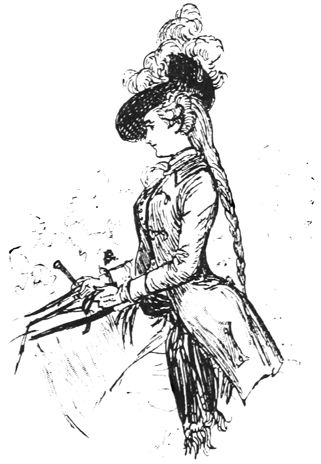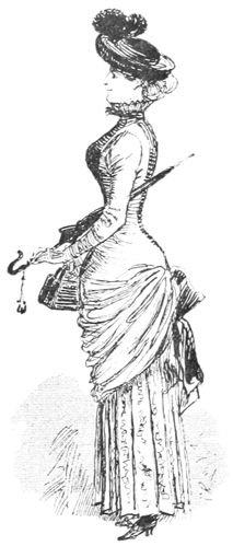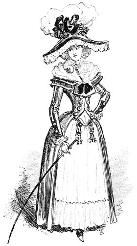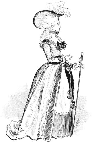 La fantaisie, étouffée depuis 1830, reparaît. Ces très cavalières jupes courtes laissent voir les bottines très luxueuses et très ornées, les fines petites bottes très montantes dont on fait sonner les hauts talons.—Un instant même quelques élégantes des plages à la mode prennent la grande canne Louis XIII.