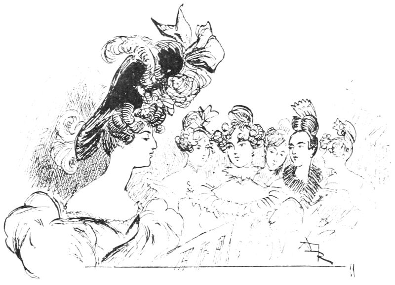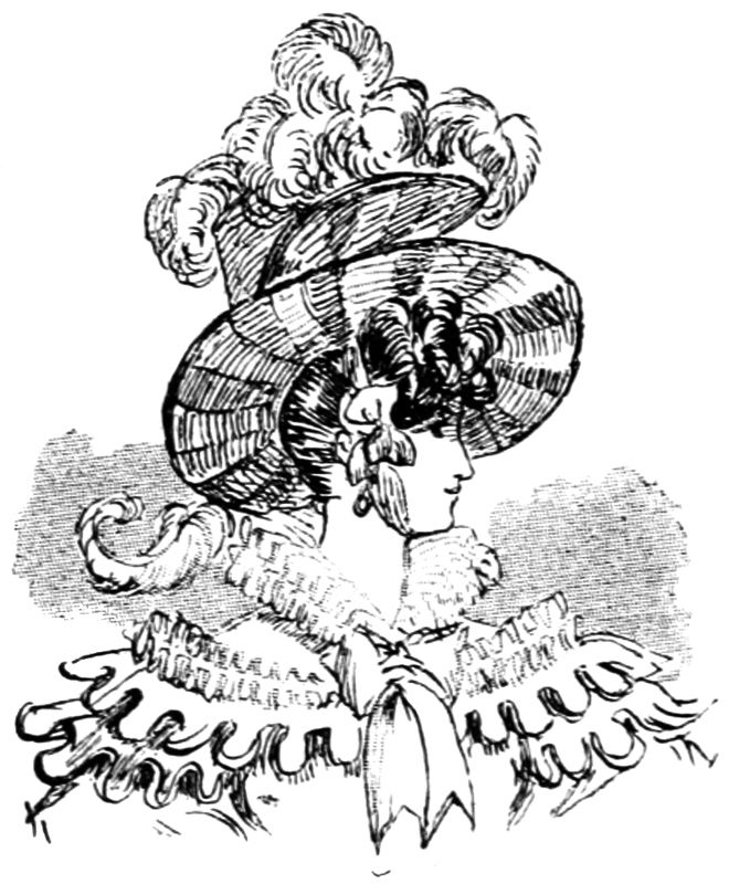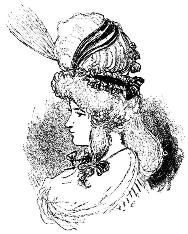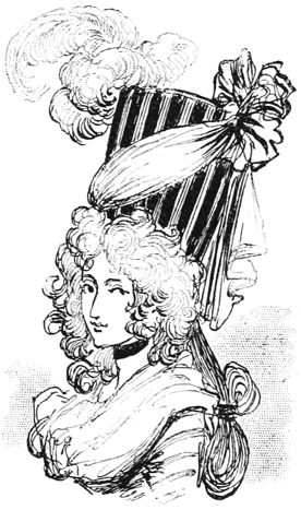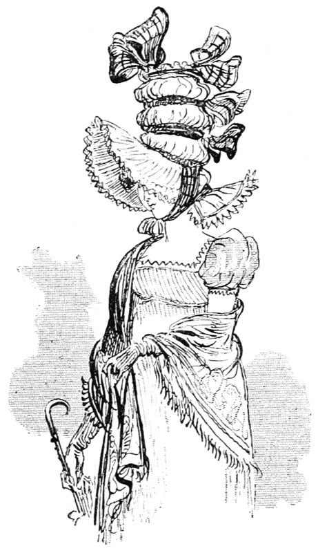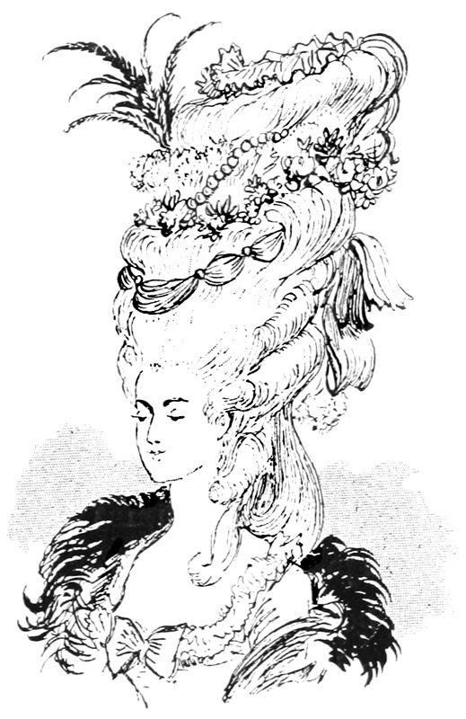 Les coiffures colossales.—Le pouf au sentiment.—Parcs, jardins potagers et paysages animés de figures sur les têtes.—La coiffure à la Belle-Poule.—Les mouches.—Modes champêtres.—Les robes négligentes.—Couleurs à la mode.—Le monument du costume.—Les amazones.—Modes anglaises.—Les bourgeoises. |