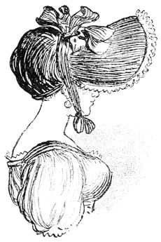 Les tristes et mesquins chapeaux en petit cabriolet, fermés sous le menton avec de petites brides, règnent sans conteste, il n'y a pour ainsi dire qu'une forme unique, à bavolet, sans autres ornements que des rubans sans grâce. La robe n'a pas la moindre ornementation non plus, le corsage est très long, la jupe droite. Sur ces toilettes plates on porte au dehors des mantelets et des châles.