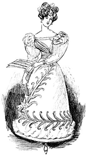 Il est vrai que les jupes s'arrondissant en coupoles flottantes sur ces crinolines si décriées, et que tout l'ensemble de la toilette étaient ornés d'une façon lourde et gauche de petits détails mesquins appliqués sur de tristes étoffes, tandis que les paniers du XVIIIe siècle ont eu pour eux une ornementation plus artiste 236 des jupes et des toilettes taillées dans les belles étoffes à ramages. Leurs exagérations et leurs ridicules avaient de la grâce, tandis que les jupes à crinoline ne rachetaient par rien leur gauche ballonnement. Un peu surfaites, les suprêmes élégances de l'Empire!