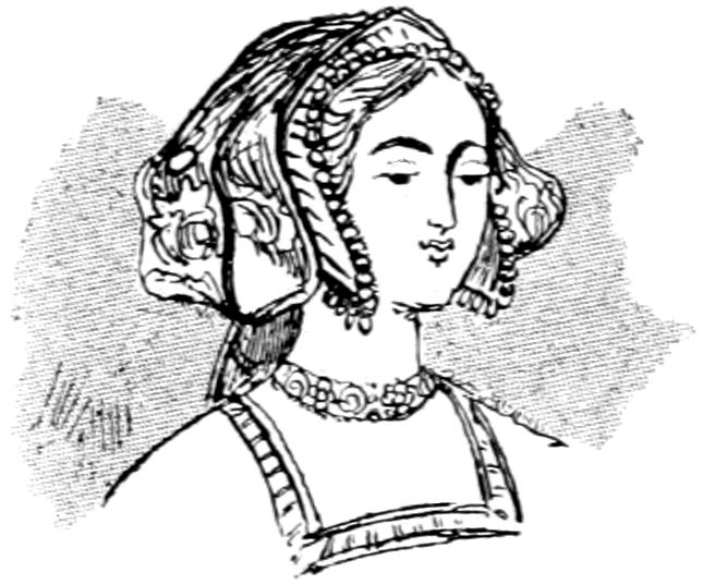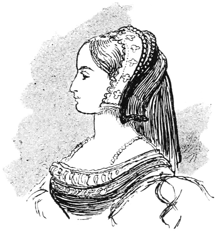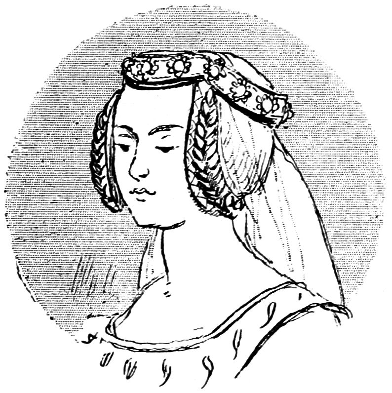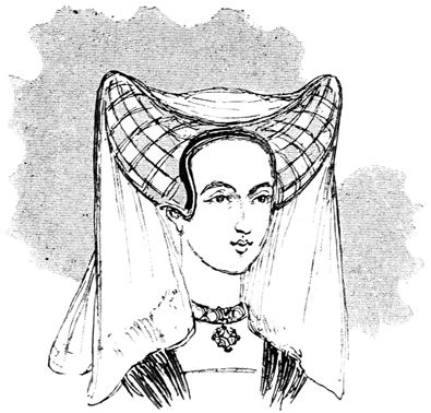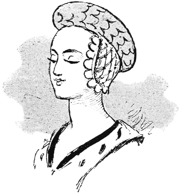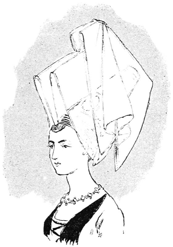 Les coiffures des dames sont de proportions extravagantes. Le hennin triomphe entre toutes. Il y a l'escoffion qui affecte différentes formes, en turban, en croissant; il y a le bonnet en cœur, énorme coiffure d'étoffe brodée, treillissée de ganses, ornée de perles, avec un gros bourrelet relevé de joaillerie retombant en cœur sur le front. Mais c'est le grand escoffion à cornes qui, sur tous les autres, scandalise les prédicateurs, l'escoffion qui est une large carcasse ornée de pierreries emboîtant les oreilles et laissant tomber de chaque corne sur les épaules une fine mousseline flottante.