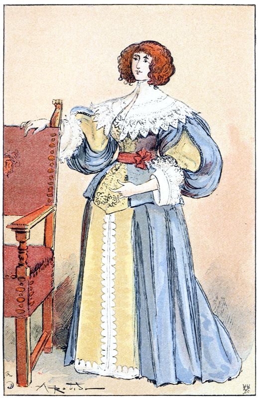 Retour à une simplicité relative.—Les femmes-tours.—Hautes coiffures.—Excommunication du décolletage.—Les robes à grands ramages de fleurs.—Collets montés et collets rabattus.—Tailles longues.—Les édits de Richelieu.—La dame suivant l'édit.—Tailles courtes. |