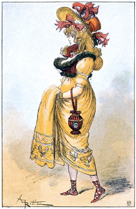 Il y avait déjà,—il y a eu toujours,—des élégantes exagérées qui outraient les fantaisies de la mode. Ainsi certaines se montraient en robes si étroites et si collantes qu'elles semblaient cousues dedans; ou bien les surcots étaient beaucoup plus longs que ces dames, et il fallait porter ce qui dépassait au moyen de poches placées sur le devant des robes, dans lesquelles on passait les mains, ou bien 37 relever la jupe et la rattacher à la ceinture, ce qui après tout était fort gracieux et faisait ces admirables plis cassés que nous voyons aux robes des statues.