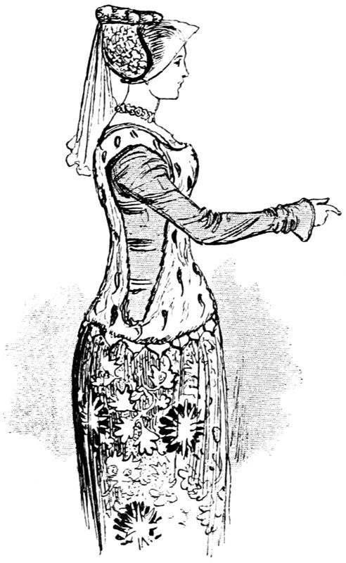 Elles sont superbes, les élégantes du moyen âge, avec leurs longues robes collantes, dont les dessins se répètent régulièrement, rosaces semées sur toute l'étoffe, carreaux alternés de couleurs différentes, faisant comme un damier de tout le corps, fleurs et ramages en larges dispositions, souvent tissées d'or ou d'argent. Ces étoffes font des plis superbes et drapent naturellement d'une façon sculpturale, des échantillons nous en restent dans les musées, nous pouvons juger de l'effet qu'elles devaient faire, coupées en belles robes traînantes.