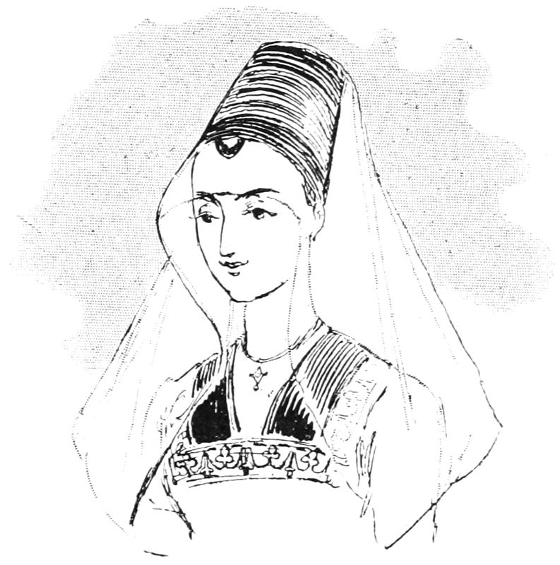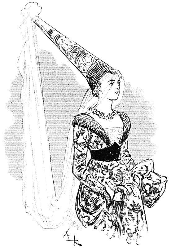 Le grand hennin est un immense cornet plaqué sur le front, emprisonnant complètement les cheveux, un tube conique en étoffe ramagée ornée de perles, avec une voilette plus ou moins longue sur le front, et tout en haut, à la pointe de l'édifice, un flot de légère mousseline retombante. Edifice extravagant, soit, incommode, mais non ridicule, monumental mais charmant, et que les femmes s'obstinèrent à porter pendant près d'un siècle, parce qu'il était en réalité très seyant et donnait à la physionomie, à l'ensemble d'une figure, de pied en cape un caractère très imposant. Et enfin, raison principale dont on ne se rendait pas compte peut-être, mais qu'on reconnaissait inconsciemment: parce que ces grands hennins cadraient avec les architectures d'alors.