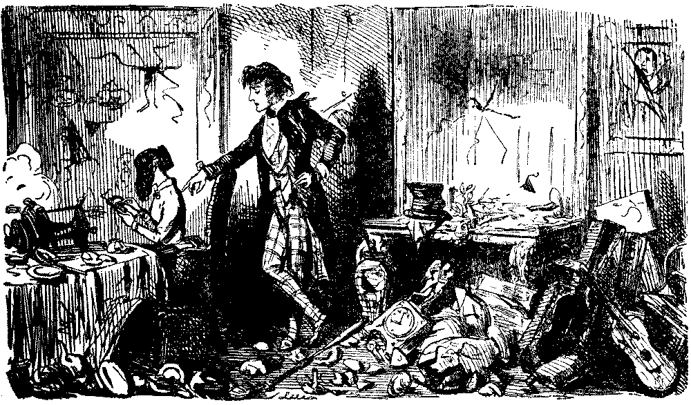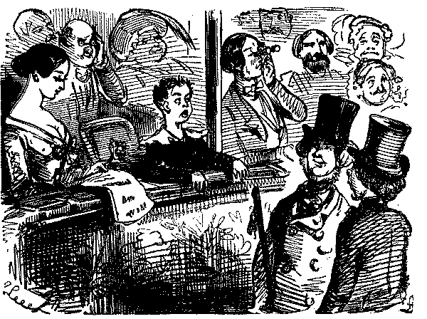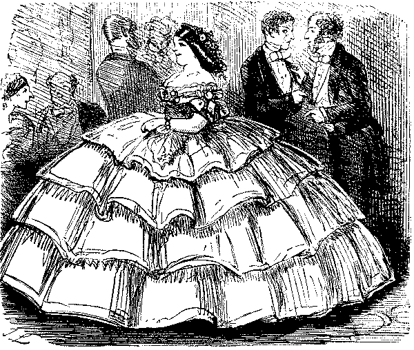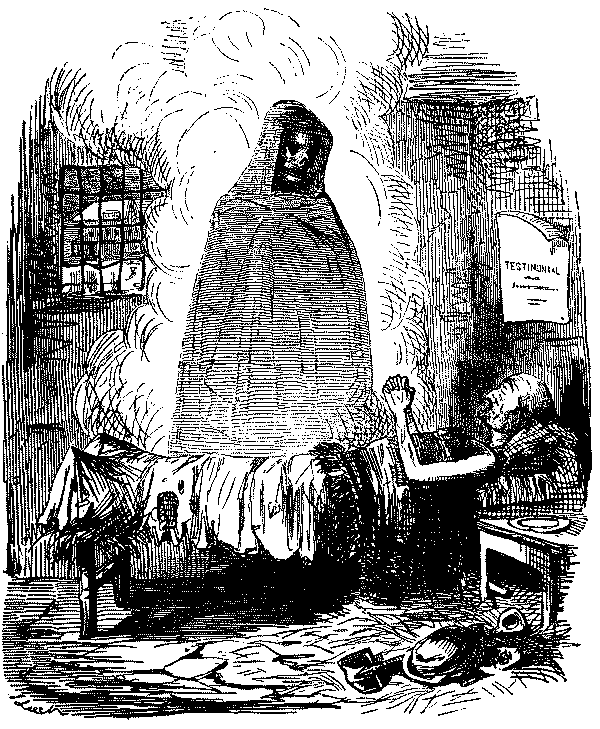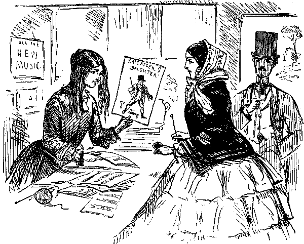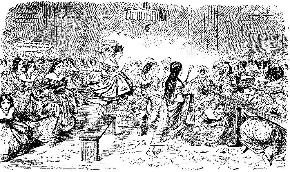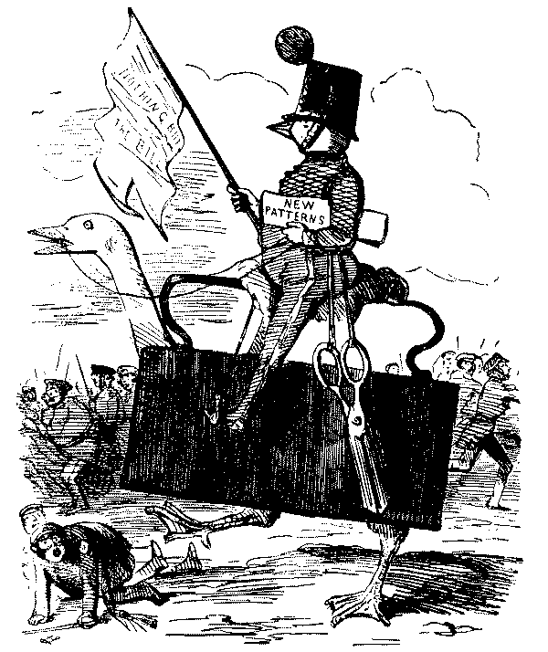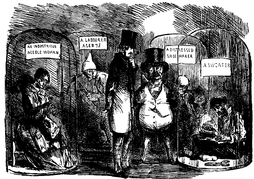 The Commission which had been engaged in learning the exact conditions of all the women and children employed in agriculture in England suggested to Punch an imaginary report of an inquiry into the state of the aristocracy, and the moral condition, employment, health, diet, etc., of the residents in Belgrave Square, most of the ladies examined being overworked by violent dancing in overheated rooms. Sweating in the cheap clothes trade was already attracting the notice of reformers, and Punch was on the warpath when a Jew slop-seller prosecuted a poor widow with two children for pawning articles which she had to make up for him. She got 7d. a pair for making up trousers, and earned 7s. a week. It was this episode, exposed in the verses "Moses and Co.," which paved the way for Hood's immortal "Song of the Shirt," the greatest poem, the most noble contribution that ever appeared in the pages of Punch. It was printed in the Christmas number of 1843, and dwarfed all the other contributions to insignificance:—