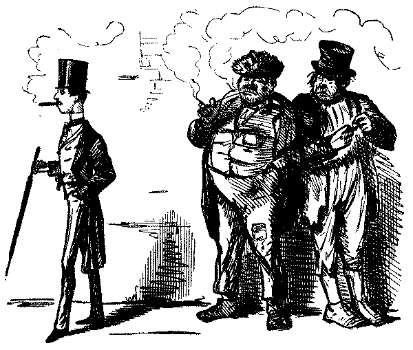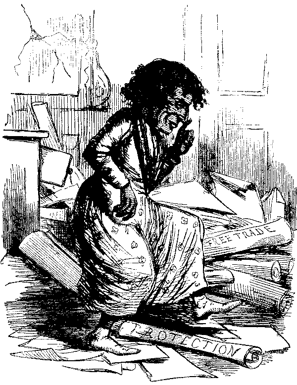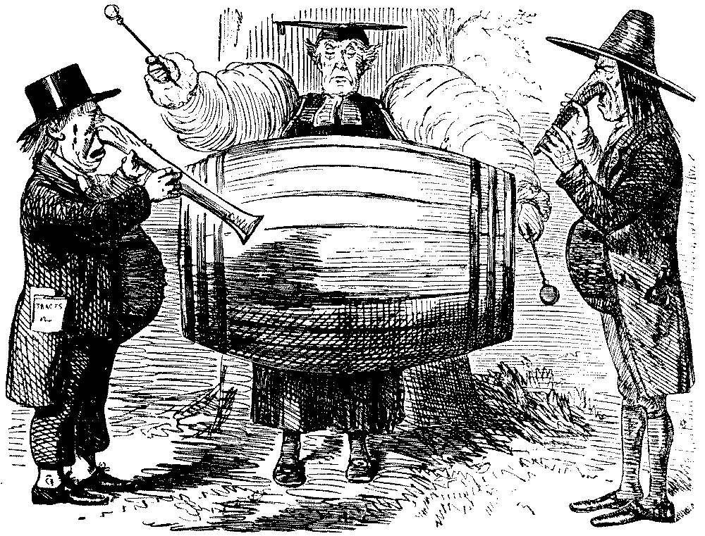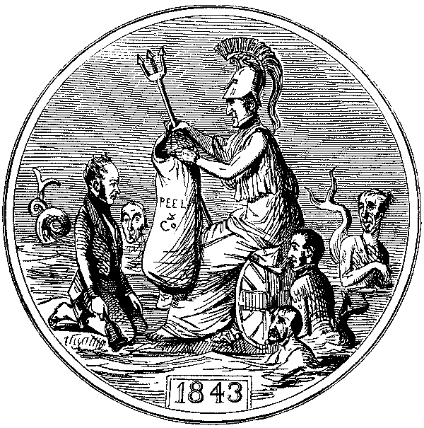 Among the various devices adopted to ventilate his personal animosity may be noted Punch's list of "desirable emigrants," and the ingenious suggestion that "Penal Statues" should be erected to commemorate the misdeeds of great offenders, obstructionists, bigots and anti-reformers. Of some of Punch's butts it may be said that they were rescued from oblivion by his satire and caricature—Sibthorp for example, though he was by no means the merely reactionary buffoon who appears in Punch. He was eccentric in dress and figure, opposed all the great measures of Reform, and was the incarnation of ultra-Tory tradition. But he was frequently[Pg 306] witty, and as truculently courageous as Punch himself. Sir Peter Laurie, Alderman and Lord Mayor of London, stood to Punch for all that was pompous, officious, meddlesome and even odious in City administration. We rub our eyes on reading in the D.N.B. that Sir Peter throughout his public life "devoted himself largely to schemes of social advancement, was a good magistrate and a disciple of Joseph Hume." But the explanation of this and other divergent records is simple enough. Punch was often too angry or enthusiastic to be just or discriminating. He wrote on the spur of the moment, with the result that he often had to revise his verdicts. We have seen this change in regard to Prince Albert, the Duke of Wellington, and Palmerston, and already Punch had reluctantly begun to admit that Disraeli was a force in politics and not a mere mountebank. The bitter attacks on Bulwer Lytton as a pinch-beck writer and padded dandy, which abound in the 'forties, ended in reconciliation and amity. We have seen the process at work again in the altered estimates of Jullien. Bunn was severely let alone, but only when it was found that the animal, as in the French saying, was so evil as to defend himself when he was attacked. Sometimes, however, Punch was implacable and impenitent. He never appears to have had a really good word to say for Daniel O'Connell, but regarded Repeal throughout as a fraud, and the "Liberator" as a self-seeking and grasping agitator. When Dan promised in 1845 to achieve Repeal in six months or lay his head on the block, and did neither, Punch only jeered at his "brazen boasting," and depicted him later on as the real "Potato Blight" of Ireland. Impenitence, too, marked his attitude towards both "Henry of Exeter" (Dr. Phillpotts), Pusey, and Wiseman; and his distrust of Louis Napoleon, after a brief period of reticence imposed during the Crimean War, revived in full force in the later 'fifties. We have also seen the converse of the process described above in the treatment of Cobden and Bright, who were rudely hauled down from their pinnacles when Punch the peace-loving Free Trader developed in the Crimean War into the bellicose patriot. The change was made in the contrary direction with Peel, but the grace of recognition was[Pg 307] grievously impaired by its delay. Posthumous honours are a sorry reparation for continual abuse of the living, and Punch's treatment of Peel is one of the worst blots on his scutcheon. In Punch's early volumes no abuse was too bad for the Conservative statesman. Even the Bible was ransacked for invidious parallels, which only stopped short of Judas. He was a "political eel," a "quack," a "genius or Janus," and there is a curious foreshadowing of the recriminations of our own time, in the way in which Peel, in virtue of his inveterate policy of temporizing, is saddled with the watchword "wait awhile."